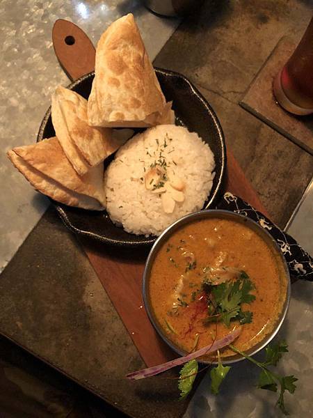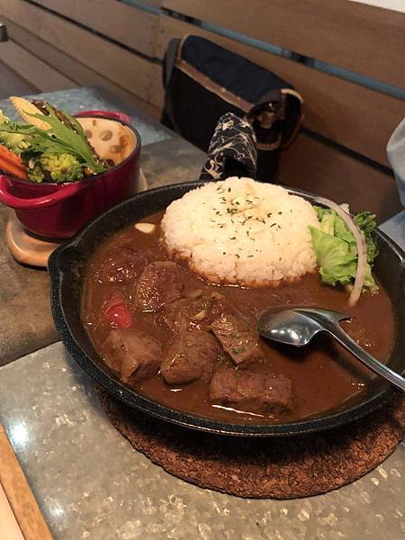 一行人點了骰子菲力牛佐野菜和南洋風豬肉咖哩
