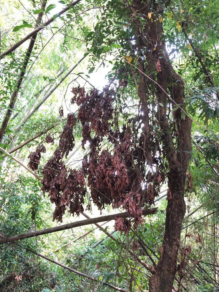 一群又一群的枯萎樹葉們,天然的乾燥葉,旁邊到處亂竄的竹子們,有的斷破了仍牢牢地掛在森林織網中,要小心,可能突然風一吹就往身上刺過來。